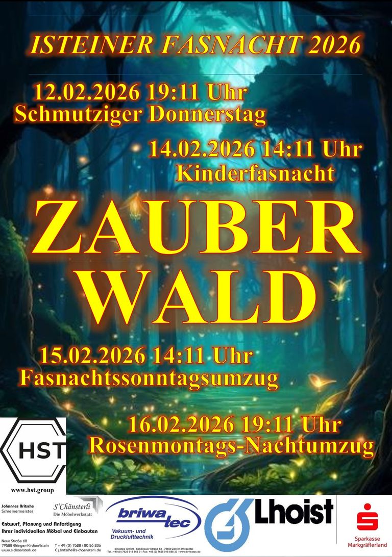 Nachtumzug um 19.31 Uhr, Start an der Festhalle, den Basler Weg entlang, vorbei am Rathaus wieder zurück zur Festhalle. Der Ausklang nach dem Umzug findet um die Festhalle Istein statt!
